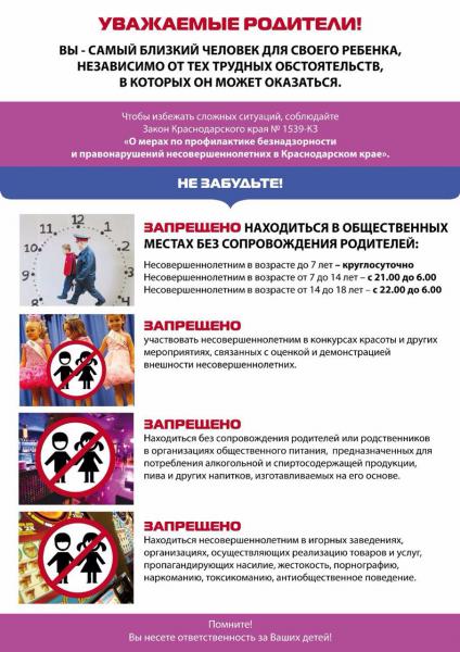 1. Пребывание несовершеннолетних в установленное законом время в общественных местах без сопровождения родителей (законных представителей)